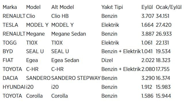 Otomotiv Distribütörleri ve Mobilite Derneği (ODMD) verilerine göre, 2025’in eylül ayı ve ocak-eylül döneminde en çok satılan ilk 10 otomobil şöyle: